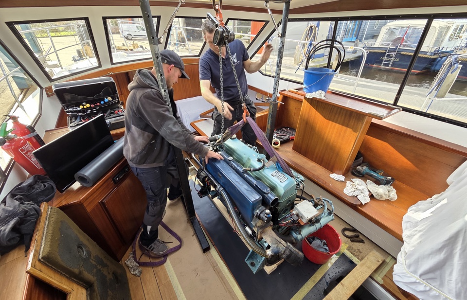 De grootste upgrade van dit jaar is zonder twijfel de nieuwe 6-cilinder Iveco motor met maar liefst 150 pk. Deze vervangt de betrouwbare Ford-motor met 120 pk, die jarenlang trouwe dienst heeft gedaan. Joren en Peter hebben de Ford inmiddels gedemonteerd en uit het schip gehesen.