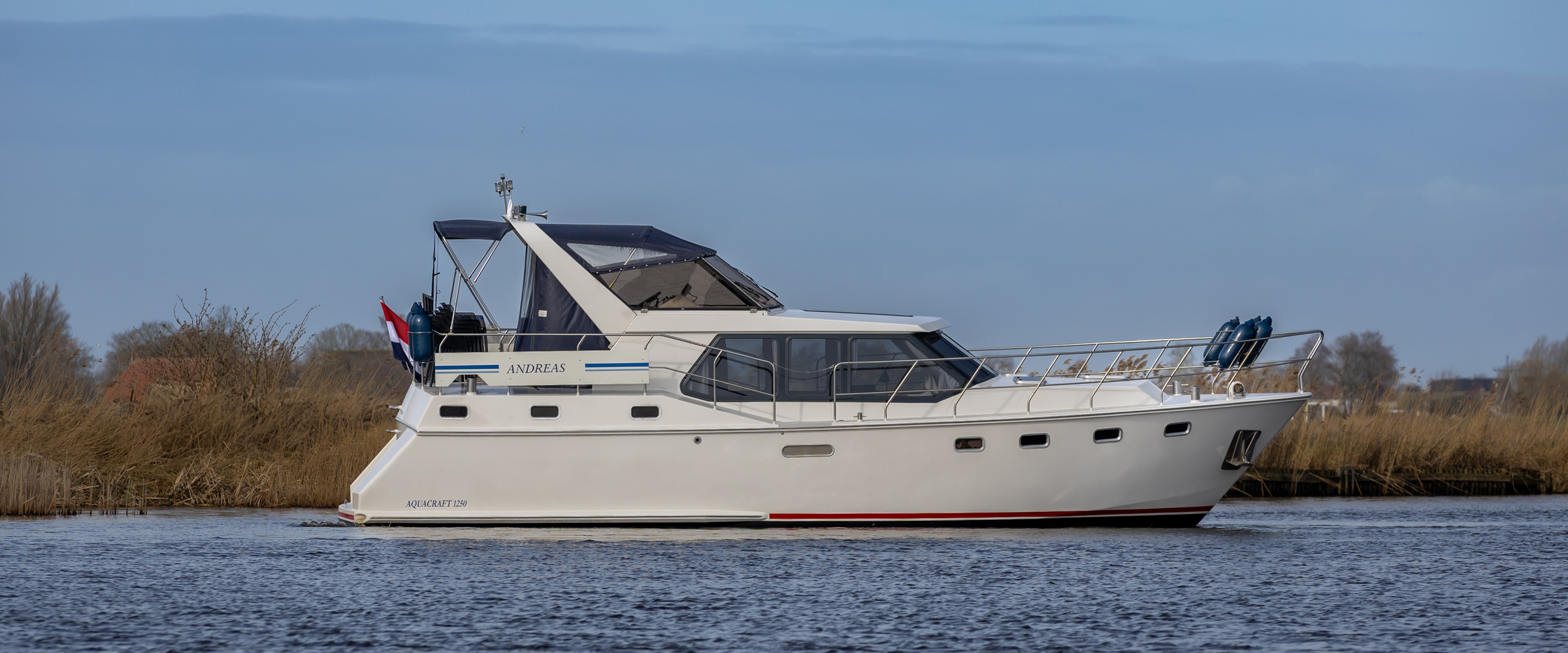 De Andreas huren zal goed bevallen. Met deze Aquacraft 1250 kunt u met 6 personen genieten van uw ontdekkingsreis op het water. Door de boeg- en hekschroef wordt manoeuvreren in kleine havens heel eenvoudig. Eenmaal op het water zult u ervaren dat de hectiek van alle dag plaatsmaakt voor de rust van de natuur, met op zijn tijd, de gezelligheid van de watersportdorpjes. De Andreas is uitgerust met een TV, radio, GPS en een biminitop (zonnekap). De motorboot is 12.50 meter lang en 4.00 meter breed en heeft een doorvaarthoogte van 4.50 meter. Het jacht heeft een diepgang van 1.10 meter en is dus goed geschikt om ook op de meren zorgeloos te kunnen varen.